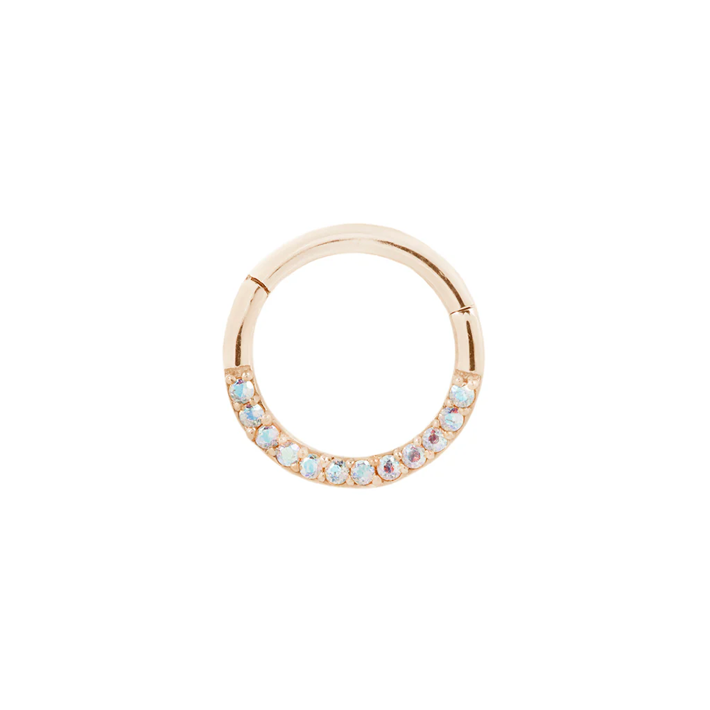 Classic elegance is always in style! Dia is the perfect way to keep it simple while complimenting your sparkle. This design features twelve round-cut mercury mist topaz stones in a pave setting along the edge of a 14kt gold ring. Dia is best adorned on the septum, daith, and helix to best showcase the dazzling gemstones. Wear everyday or dress it up with your other jewelry treasures for a night out!