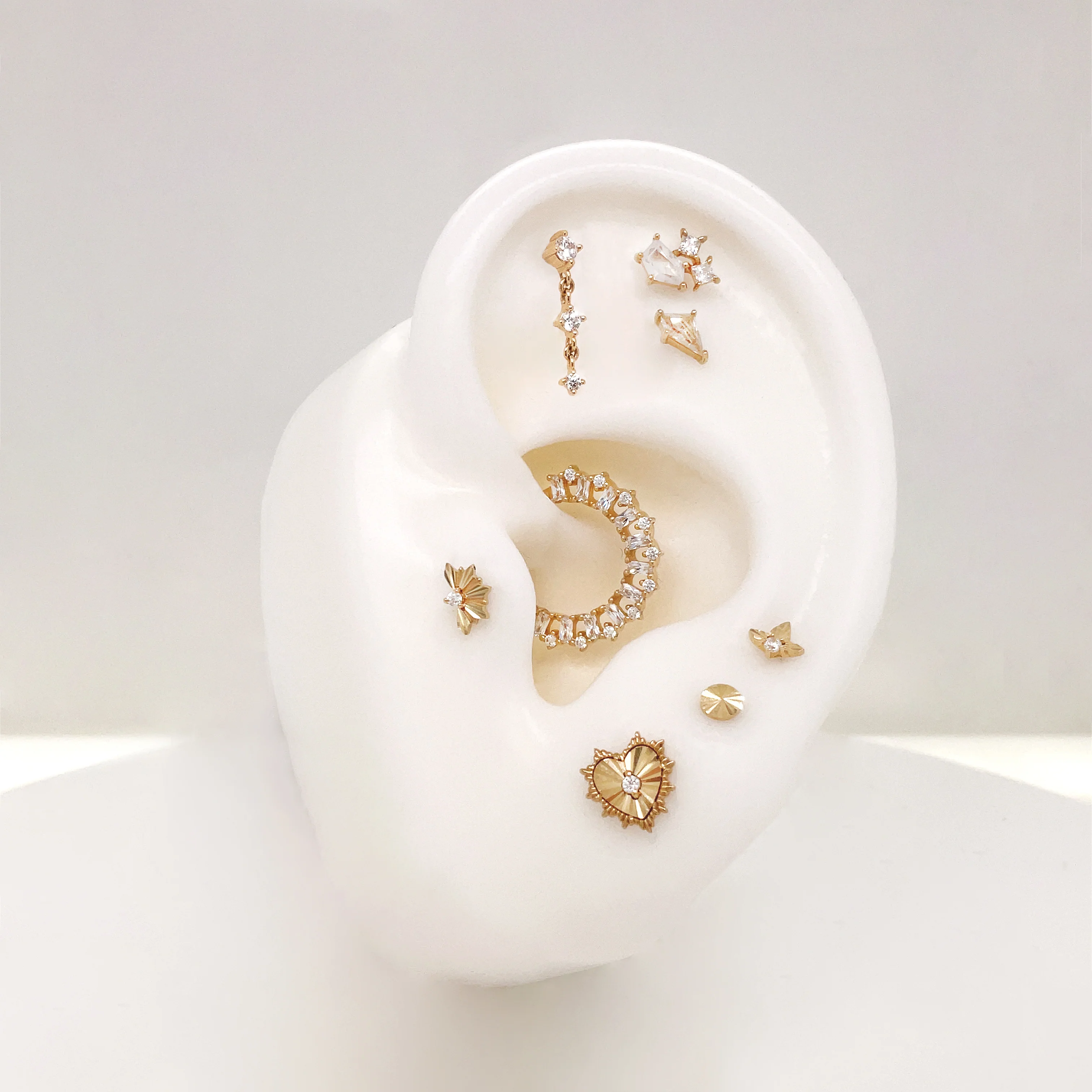 Multi-dimensional 14kt Gold crafted into a low-profile Lazer Disk. Excellent piece for your Helix, Tragus, Lobes, Nose + more! This piece can create so many alternative looks using both sizes (3mm + 4mm) in the same curation.