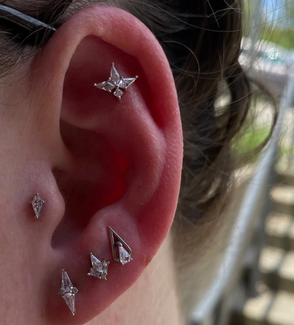 A gorgeous combination of our Kite and Baguette cut CZ's, this new piece is just all the craze! A true standout piece that works perfectly for your conch or flat piercings!